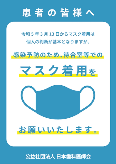 来院される皆様におかれましても、院内でのマスク着用について、ご協力をお願い致します。