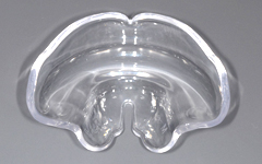 ムーシールドは乳歯列期に使用し、成長期に正常な噛み合わせに誘導するマウスピース装置です。低年齢の幼児でも使用できます。ムーシールドは舌や唇それに頬などの筋肉機能を正常に整え、反対咬合(受け口)から正常な噛み合わせに誘導します。 取り外し可能な簡単な装置を就寝時に使います。 乳歯列が完成する3歳頃から使えるため、反対咬合の治療に適しています。